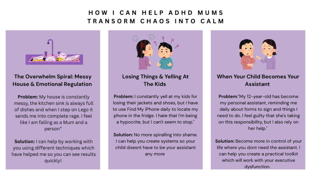 I help newly diagnosed or late diagnosed ADHD Mums who are tired of feeling constantly overwhelmed and wondering if cereal for dinner is ok for the second time this week.